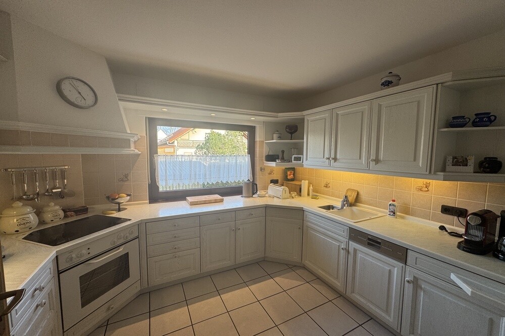 Die Böden im Haus bestehen aus Fliesen und Teppich und befinden sich – ebenso wie die übrige Ausstattung – in einem dem Baujahr entsprechenden, gepflegten Zustand. Die Küche ist separat gehalten und bietet ausreichend Platz für den täglichen Bedarf.