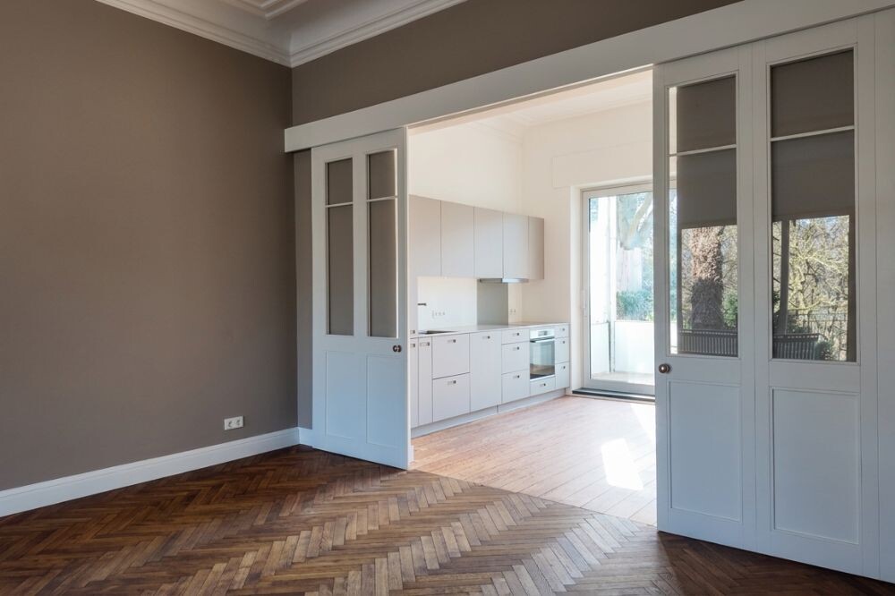Originaler Fischgrätparkettboden im Wohnbereich unterstreicht den stilvollen Altbaucharakter